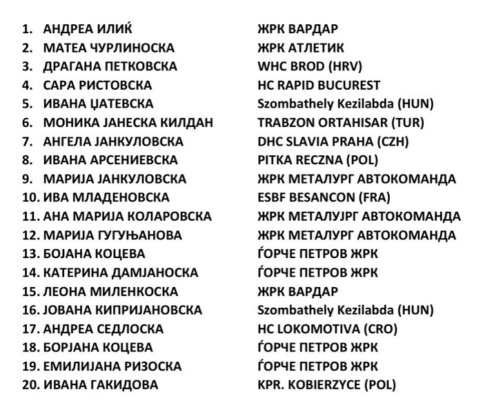 На скратениот список на Грчевски се наоѓаат следниве 20 ракометарки: