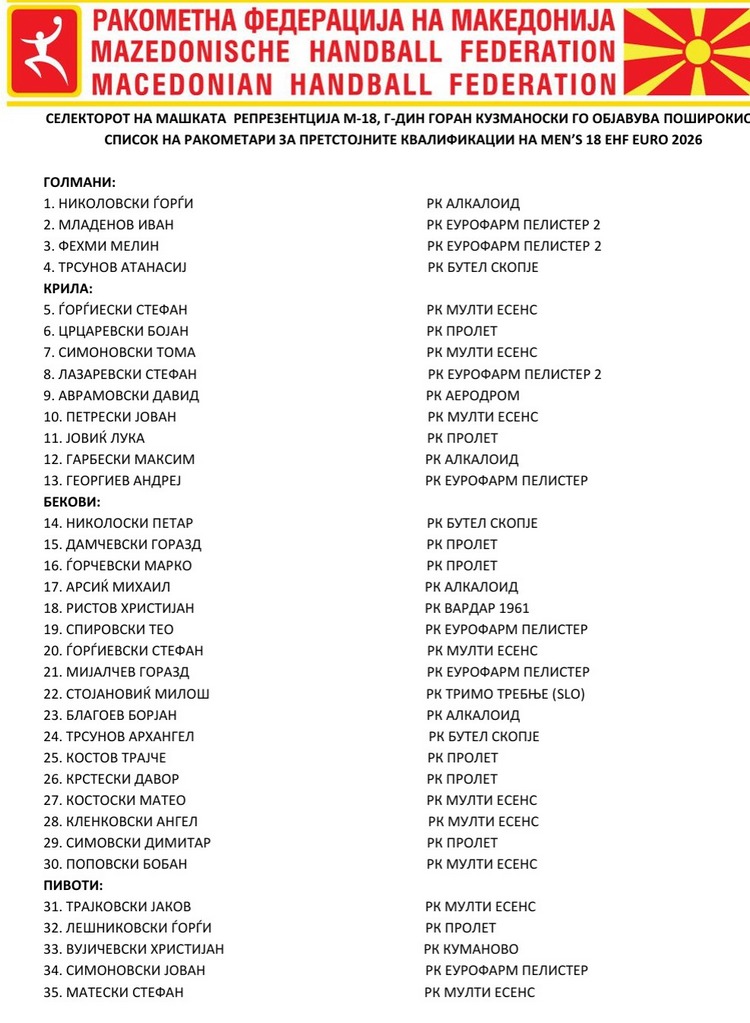 Машката кадетска репрезентација на Македонија, нова генерација на ракометари на крајот на месецов ја почнува својата европска приказна. Момците на возраст до 18 години ќе бидат предводени од Горан Кузманоски, а нивната авантура почнува со квалификации што ќе ги играат во Луксембург од 31 октомври до 2 ноември против репрезентациите на Финска, Грција и Луксембург, по тој ред.