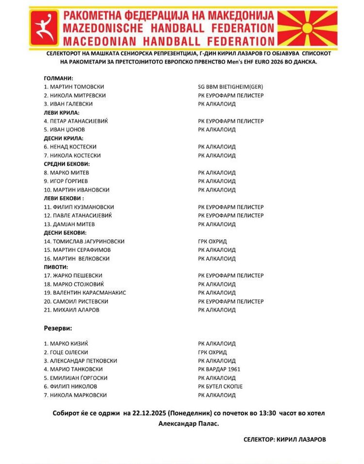 Селекторот на машката репрезентација на Македонија, Кирил Лазаров, го скрати списокот на ракометари со кои ќе настапи на Европското првенство во Данска во јануари 2026.
