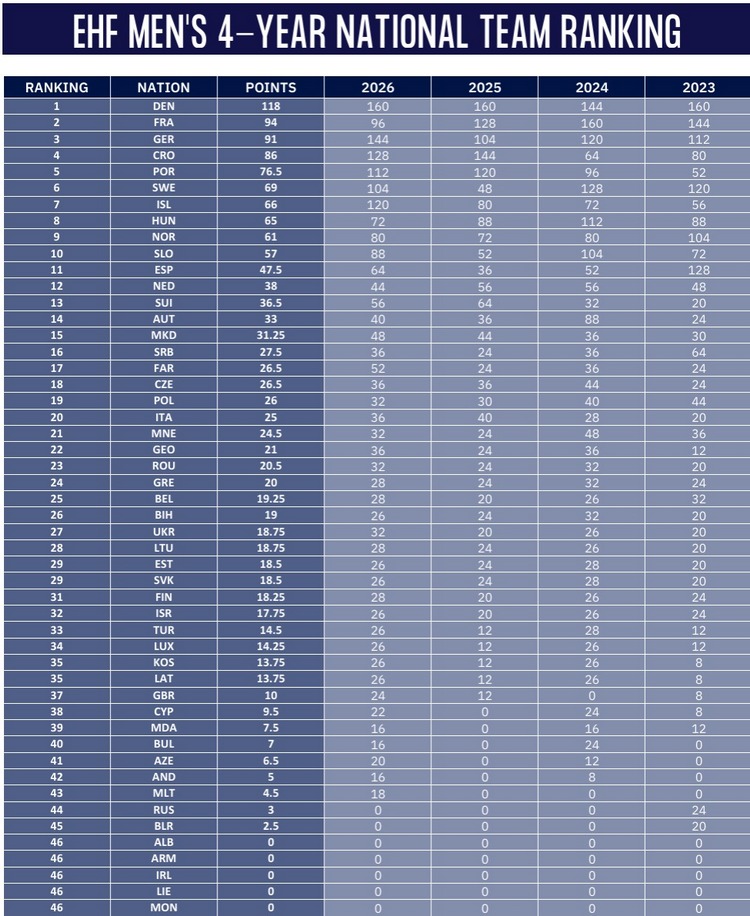 Македонија на новата ранг листа е на 15 место и ќе остане во вториот шешир во квалификациите за следното Европско првенство што ќе се одржи во 2028, во истиот шешир со Холандија, Австрија, Србија, Ф. Острови...