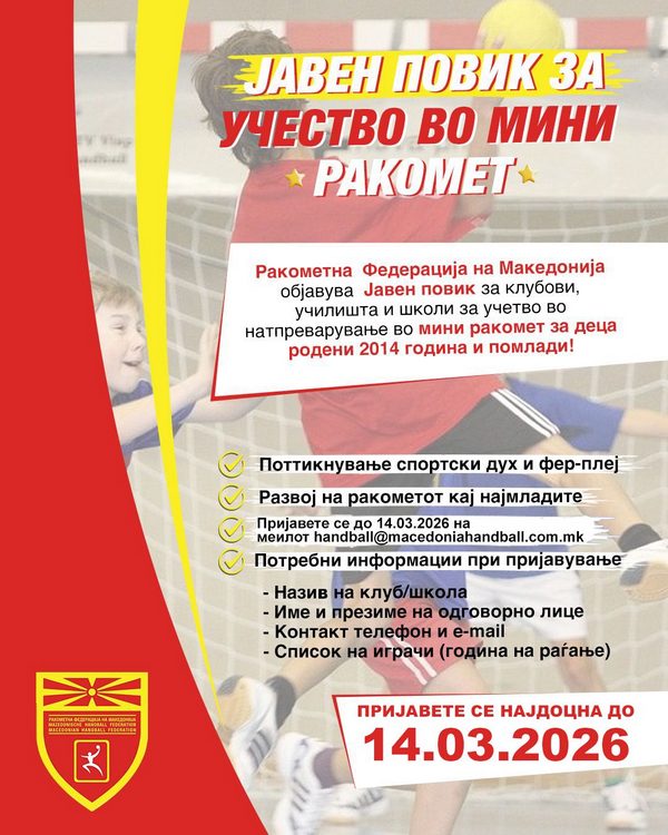 Ракометната Федерација на Македонија објавува Јавен повик за организирање и учество во натпреварување во Мини ракомет за деца родени 2014 година и помлади, со цел развој на ракометот кај најмладите и поттикнување спортски дух, фер-плеј и здрави навики.
